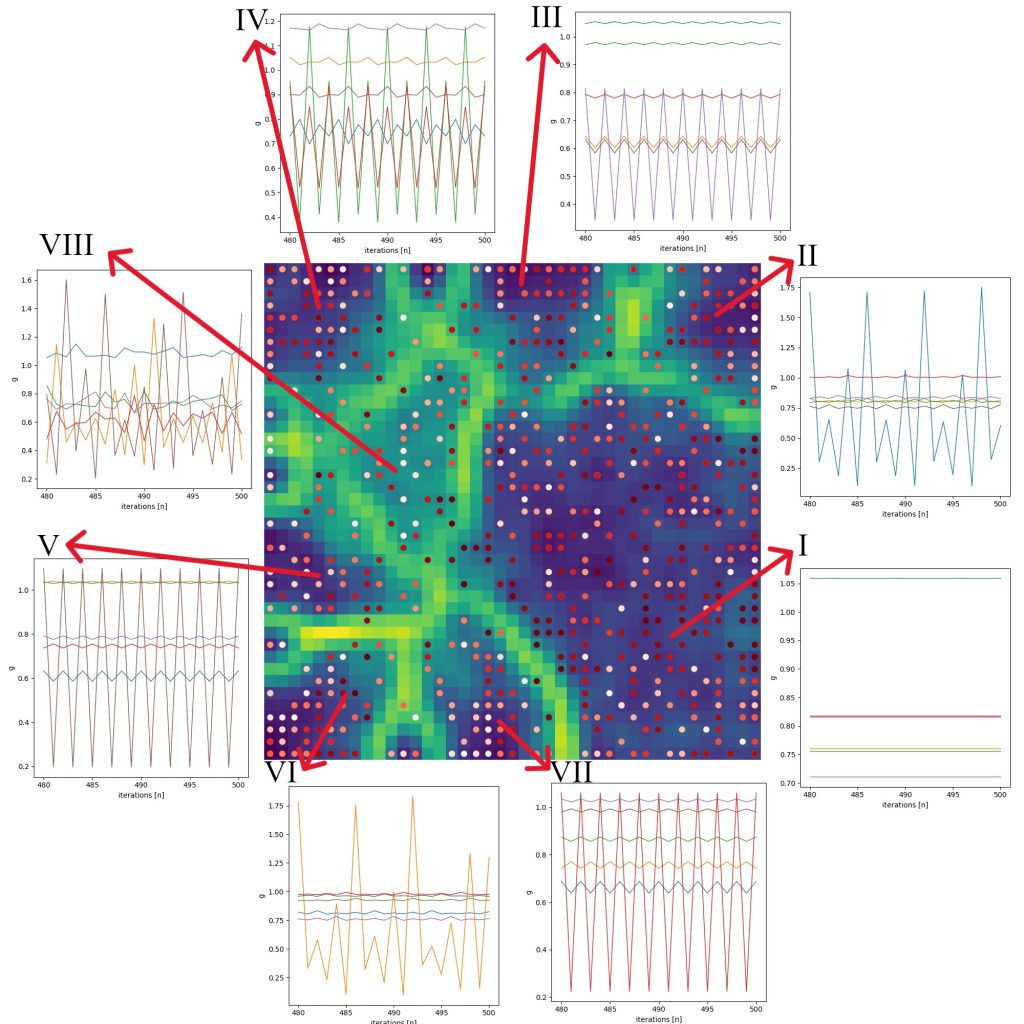 The blue and green plot in the middle is the output of a machine-learning algorithm, trained by many possible social or political implications in a planning scenario. The green ridges split different areas in the plot, where each area shows very similar behaviour of the temporal development of stakeholders. Examples of these regions are plotted around the main plot. Now, in a public participation project it can be decided which of these actions to take.